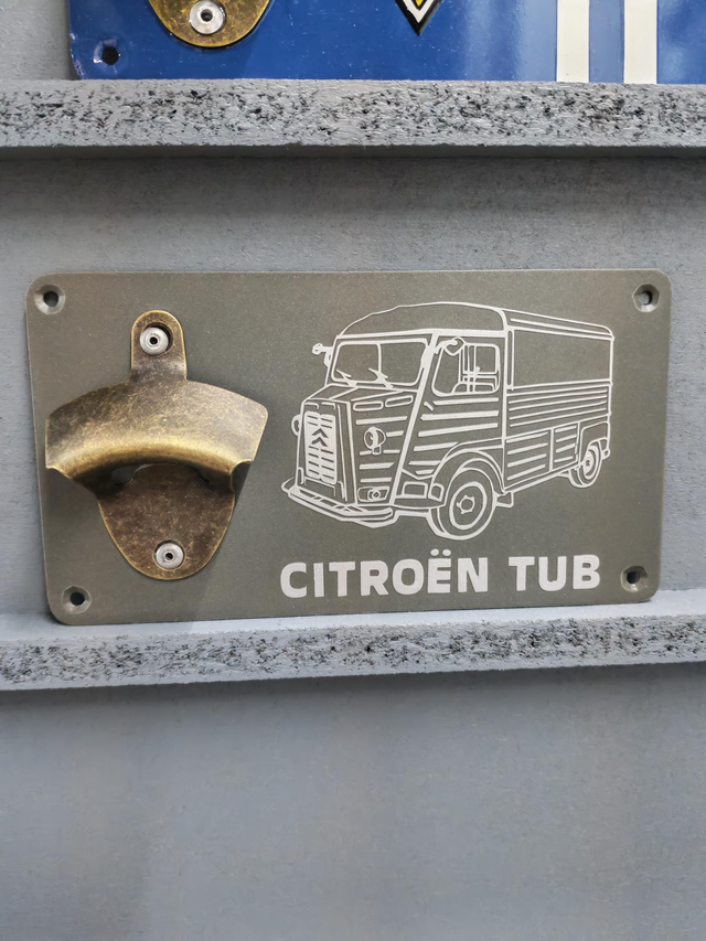 Un système d'ouvre bouteille est fixer sur la plaque en métal a l'aide de rivets.