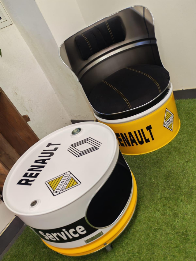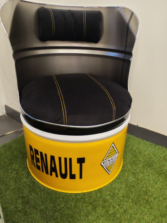 Fauteuil de salon réalisé en baril d'huile recyclé. Ainsi chaque modèle de fabrication française est unique