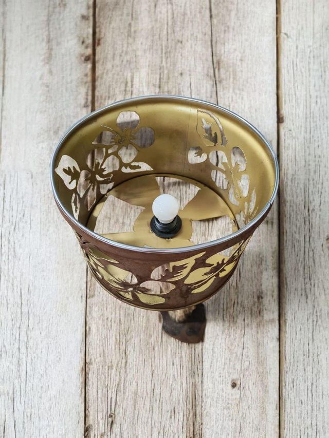 Lampe en bois flotté et baril d'huile recyclé effet rouille