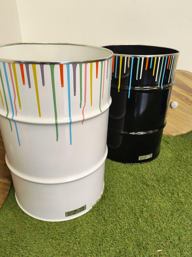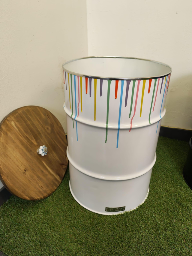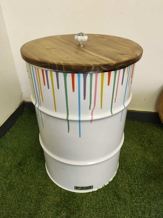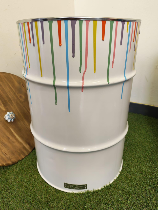 Coffre de rangement blanc en baril d'huile recyclé avec couvercle avec coulure de peinture multicolore