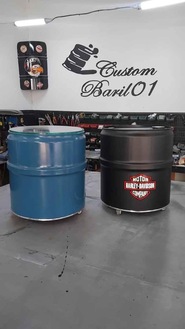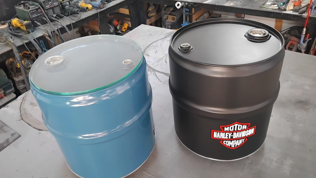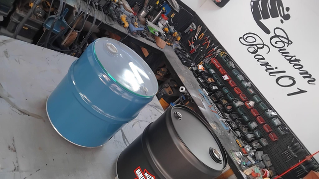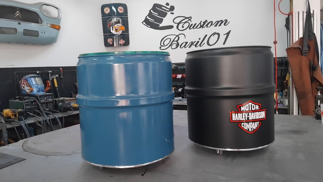 Le baril est découpé, nettoyer, poncé et repeint de plusieurs couches noire